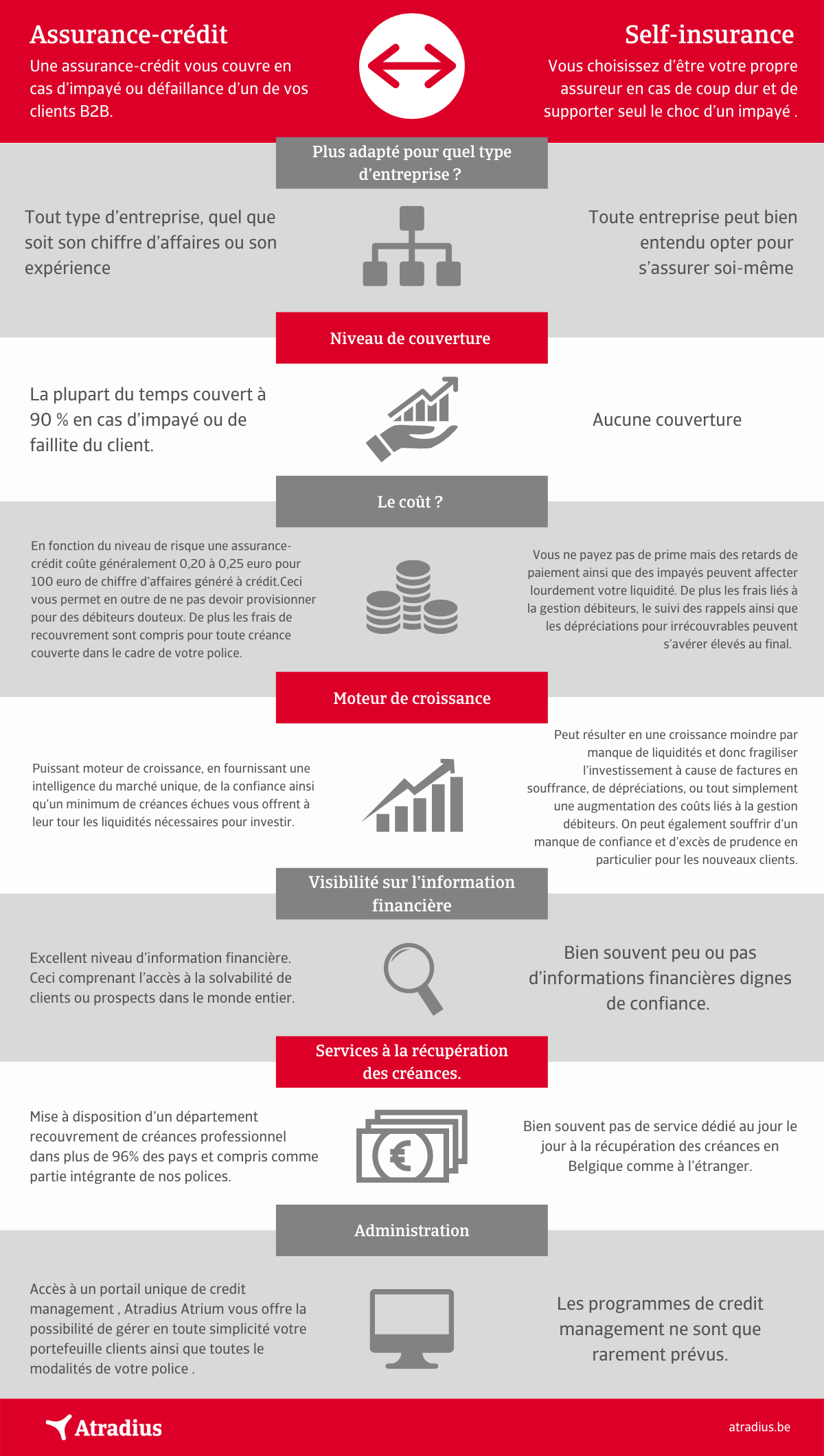 L’assurance-crédit et la self-insurance sont deux modes par lesquels les entreprises appréhendent la gestion de leur risque crédit lors de l’attribution de condition de paiement à leurs clients B2B Dans ce blog, nous examinons de plus près les deux approches et constatons que l'assurance-crédit offre plusieurs avantages, tandis que l'auto-assurance est peut-être mieux décrite comme "ne pas être assuré" et comporte un certain nombre de coûts cachés en plus des risques commerciaux.